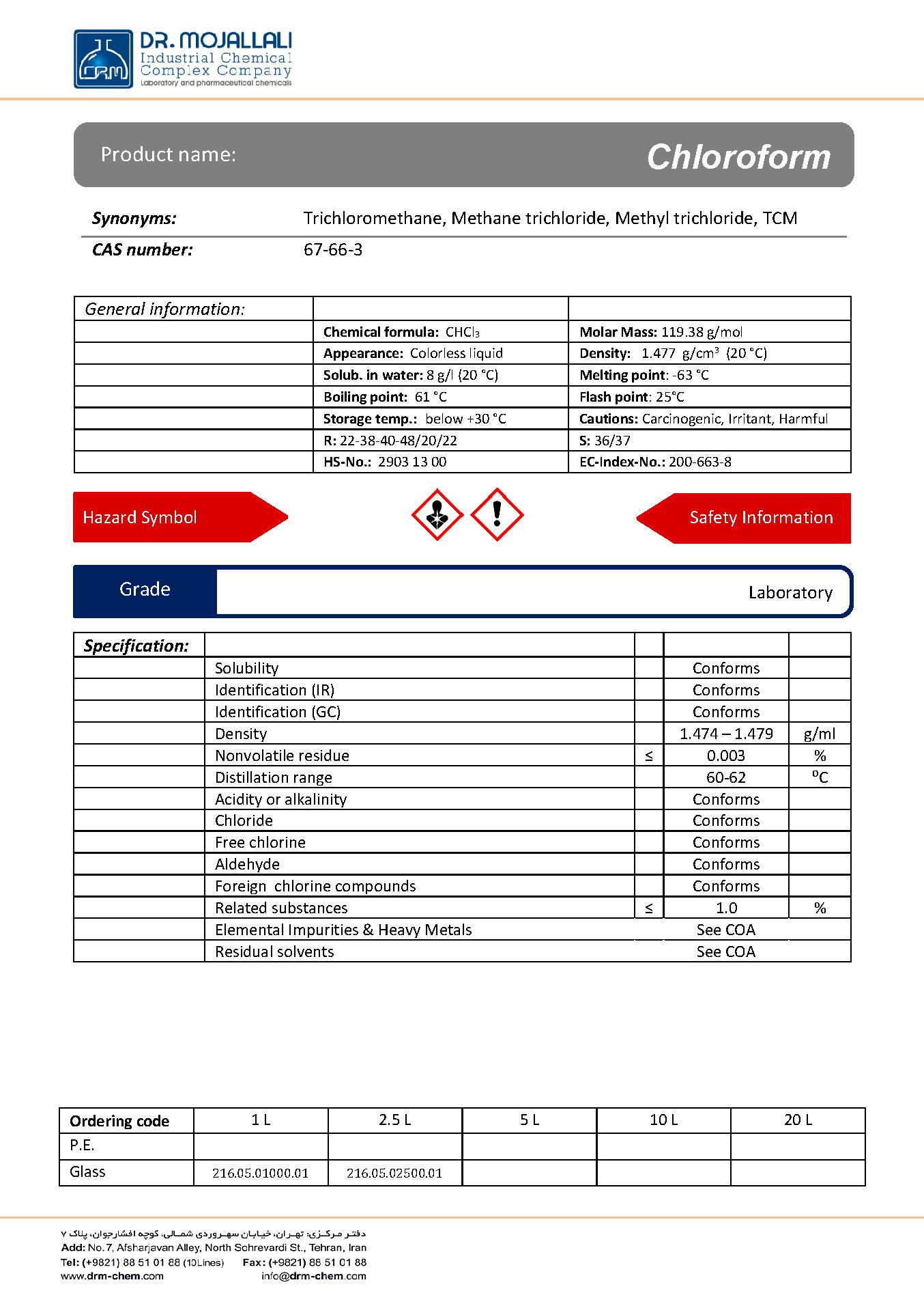 | Chemical formula: CHCl3 | Molar Mass: 119.38 g/mol |