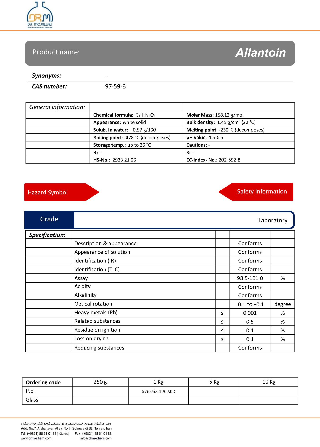 | CAS Number: 97-59-6 EC Index Number: 202-592-8 Molar Mass: 158.12 g/mol Chemical Formula: C4H6N4O3 |