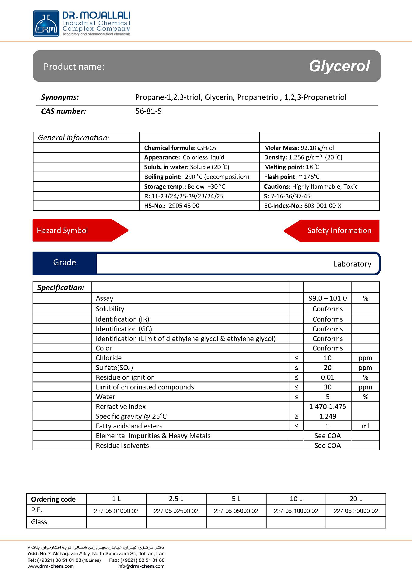 | CAS Number: 56-81-5 EC Number: 603-001-00-X Molar Mass: 92.10 g/mol Chemical Formula: C3H8O3 |