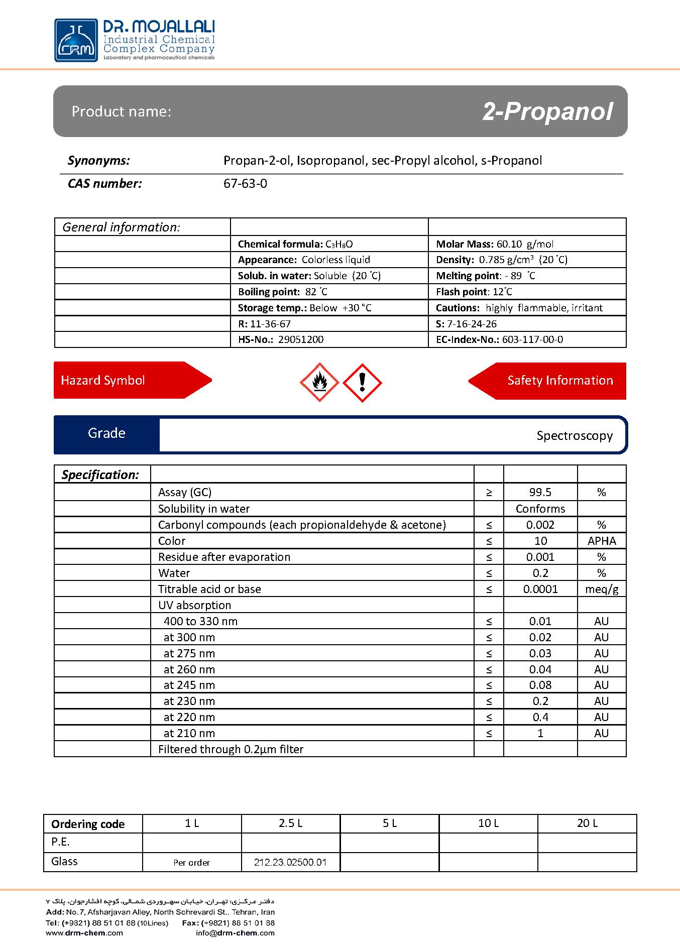 | CAS Number: 67-63-0 EC Number: 603-117-00-0 Molar Mass: 60.10 g/mol Chemical Formula: C3H8O |